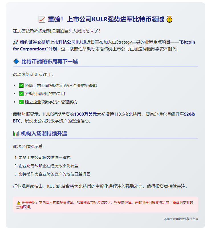 KULR加入企业比特币计划 2025年6月10日 上午10:53 • 币资讯 原创文章,作者:admin,如若转载,请注明出处:https://www.23btc.com/41627/ 赞 (0) 0 生成海报 AAVE涨破290美元 上一篇 2025年6月10日 上午10:44 “巨鲸质押7.4万SOL借款400万USDC抄底HYPE” 下一篇 2025年6月10日 上午11:09 相关推荐 币资讯 OpenSea旗舰收藏含胖企鹅与CryptoPunks 2025年9月10日 0 美国证券交易委员会正式对XRP裁决提出上诉。 【2024-10-18 07:49】23btc报道,美国证券交易委员会(SEC)已正式对Analisa Torres法官针对XRP的裁决提出上诉,这一举动再次点燃了关于加密货币交易… 币资讯 2024年10月18日 0 BNB Chain:第二轮TVL激励计划即将截止,还剩2天。 【2024-04-12 23:32】23btc报道,BNB Chain 官方在 X 平台发布公告称,第二轮 TVL 激励计划即将截止,还有 2 天即将结束。早前消息显示,BNB C… 币资讯 2024年4月12日 0 币资讯 CRV/USD的铸造数量达到了1.31亿枚。 【2024-06-17 05:49】23btc报道,根据Curve网站的数据显示,Curve原生稳定币crvUSD的铸造数量已经超过1.31亿枚,截至目前为止达到了131,341,… 2024年6月17日 0 币资讯 创投周期:热钱从代币涌向股市 2025年6月17日 0 币资讯 特朗普授权放宽部分对华出口管制 2025年6月10日 0 币资讯 UNI价格跌破5美元大关。 【2024-08-05 09:12】23btc报道,市场行情显示,UNI已跌破5美元,现报4.99美元,日内跌幅达24.28%。行情波动剧烈,请各位投资者注意风险控制。 对于UNI… 2024年8月5日 0 币资讯 Strategy股价跌超10%,报158.77美元 【突发】Strategy股价狂泻超10%!跌至158.77美元,市场反应剧烈 23btc最新消息 — 比特币财库公司Strategy股价今日遭遇重挫,跌幅已扩大至惊人的10.39%… 2025年12月1日 0 币资讯 Binance上线Morpho理财及交易服务 2025年10月3日 0 币资讯 比特币跌破11.8万美元 2025年10月11日 0