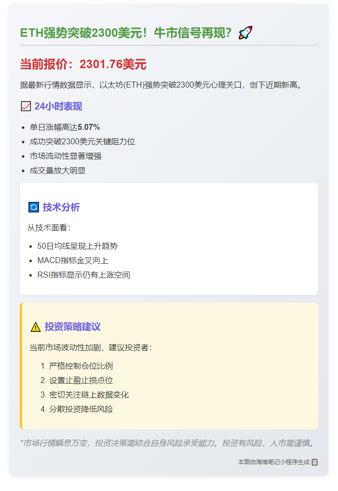 ETH突破2300美元 2025年6月24日 上午2:15 • 币资讯 原创文章,作者:admin,如若转载,请注明出处:https://www.23btc.com/47576/ 赞 (0) 0 生成海报 伊朗原油未受袭 分析师称出口无忧 上一篇 2025年6月24日 上午1:52 美官员:伊朗或袭击更多美军基地 下一篇 2025年6月24日 上午2:23 相关推荐 币资讯 标题:ICP跌穿5美元 2025年6月19日 0 币资讯 美元指数微跌至98.782 2025年8月6日 0 币资讯 Binance Web3钱包全新升级,新增ARC-20协议集成及Taproot技术支持,为用户带来更丰富的功能体验。 【2024-05-03 01:01】根据官方通告,Binance Web3 钱包最近有了新的升级。其中,Binance Inscriptions Marketplace 中新增了 … 2024年5月3日 0 币资讯 美联储谨慎支持降息 2025年10月9日 0 币资讯 ZEUS股票在当日突破了1美元的关口,一举涨幅达到了37%。 (提示:删除新闻中不重要的部分,改写得更简洁明了) 【2024-04-08 11:39】23btc报道:根据最新行情显示,ZEUS 价格已经突破1美元大关,当前股价为0.9951美元,日内涨幅高达37%。但是,由于行情波动较大,建议… 2024年4月8日 0 币资讯 机构再转4000万美元入WLFI,疑持续OTC购入 2025年6月12日 0 ZK Nation:即便符合全部7项标准,也有可能无法获得空投资格。 【2024-06-16 00:12】23btc报道称,ZK Nation 在最新的常见问题解答文档中指出,即使满足了所有七项标准,也不一定能够获得空投资格。ZKsync 用户的空投… 币资讯 2024年6月16日 0 币资讯 美联储沃勒:通胀受控或需降息 2025年7月18日 0 2030年,比特币在市值方面将达到150万美元的预测仍然保守。随后的一个或两个周期,比特币将迎来大规模应用的爆发。 (润色:将中文描述更加简洁,并用更优美的措辞表达同样的意思) 【2024-04-09 13:00】4月9日消息,2024香港Web3嘉年华举办了《圆桌讨论:比特币十五年》,Cobo联合创始人兼CEO神鱼在会上表示,近年来,华人背景的创业者在比… 币资讯 2024年4月9日 0 币资讯 Tether 平台 Hadron 整合 Chainalysis 工具 Tether旗下Hadron代币化平台完成重大升级:Chainalysis合规方案正式落地 行业重磅:稳定币巨头Tether今日宣布,其旗舰资产代币化平台Hadron迎来重大合规升… 2025年5月6日 0